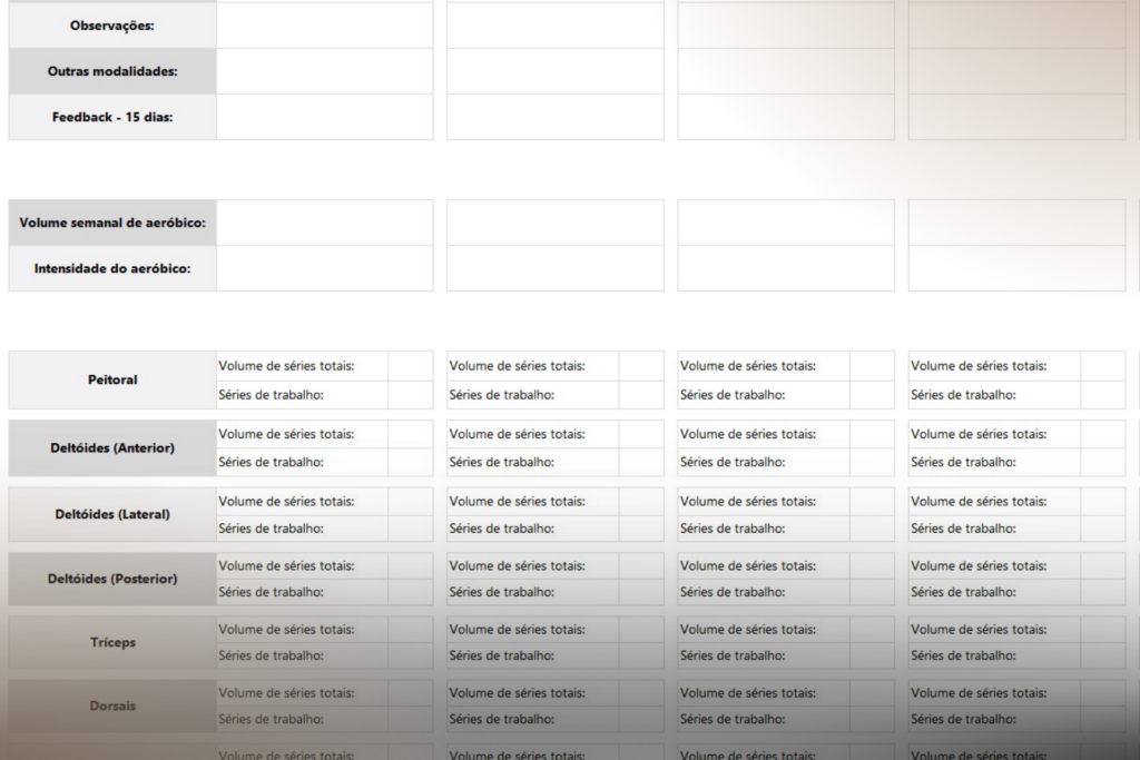 Cada planilha tem a duração de 05 semanas, após esse período a estratégia será alterada com progressões para que você continue tendo resultados (em média 01 semana para o próximo treino).