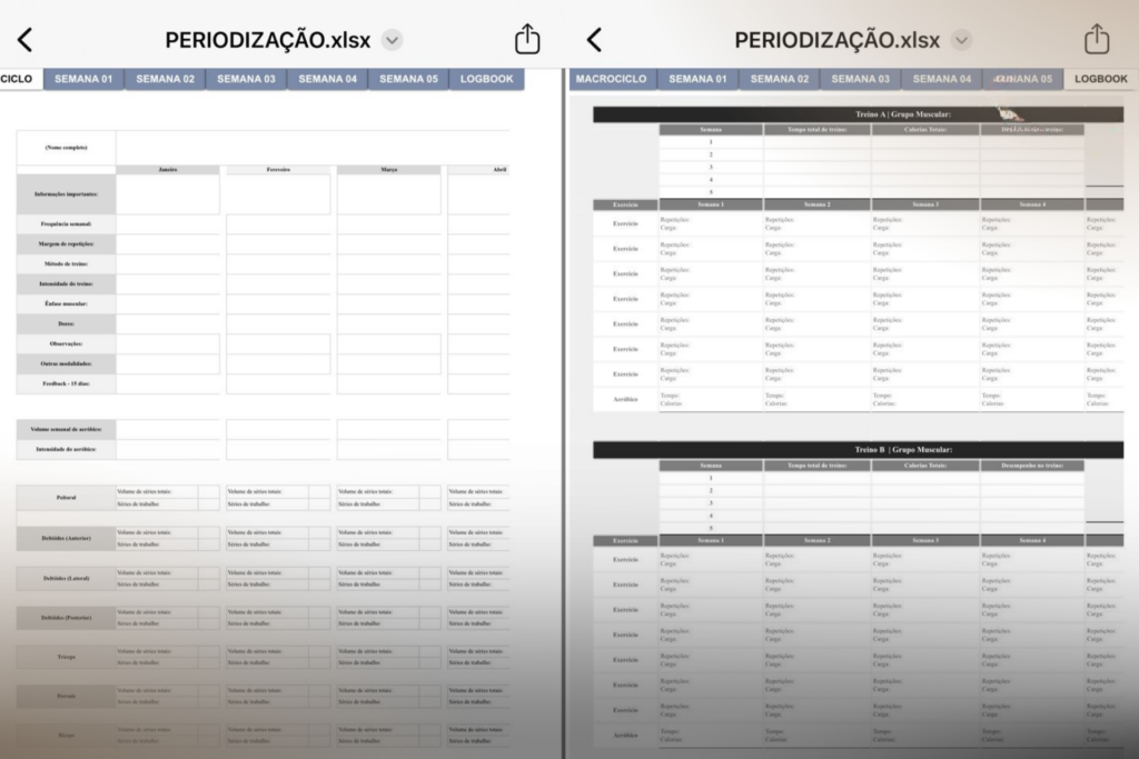 Uma planilha personalizada para acompanhamento de progressão dos exercícios.
